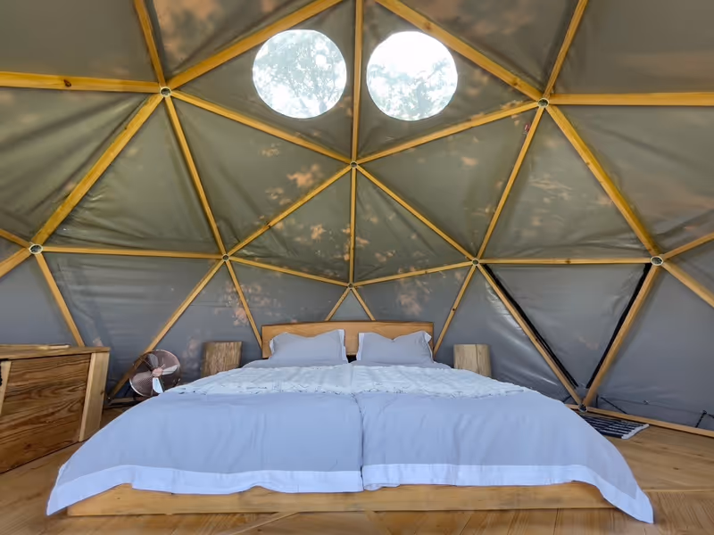Na východě Slovenska, již v blízkosti krásných vinařských oblastí slovenského Tokaje, se na louce v lese ukrývá futuristický geodům. Z recyklovaného materiálu ho ručně vyrobil šikovný Lukáš. Vše tu prošlo jeho rukama. Dobře, možná nepletl a nešil polštáře nebo deky, ale zbytek je jeho dílo. Venku na vás kromě sprchy pod holým nebem čeká i vyhřívaná káď a jako poslední novinku Lukáš nachystal pohodové posezení u ohně.