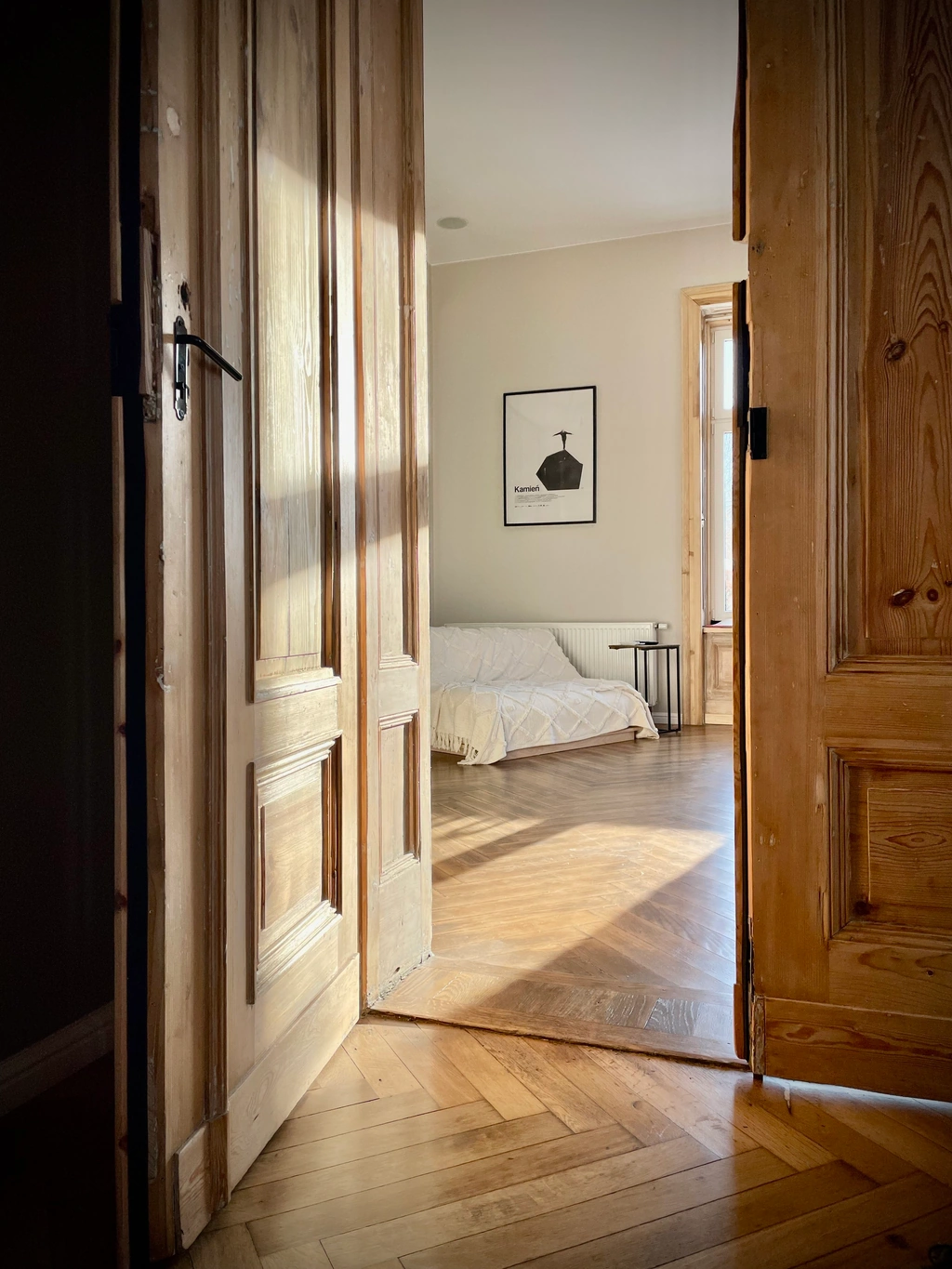 Gdyby nasza UX Katie miała aplikować o obywatelstwo w jakiejś slowhopowej miejscówce, ten apartament mógłby być jej placówką dyplomatyczną. Co ją tu rozmiękcza wizualnie? Przede wszystkim piękna stolarka okienna oraz białe podłogi (i do tego drewniane!). No i to, że Gospodarze nie boją się bieli w materiałach – zasłonach, poduszkach czy pościeli. To taki luksus, który nie potrzebuje logotypu, a dobrze zestawiona biel pięknie eksponuje resztę wyposażenia. Kasia daje tu 🤍 z wykrzyknikiem, a my proponujemy: zobaczcie uzasadnienie na własne oczka.