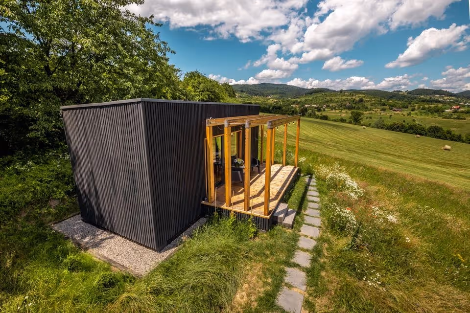 Súčasťou mini drevo-domčeka je všetko potrebné, vrátane terasky s výhľadom a dokonca aj s elektrickým krbom.