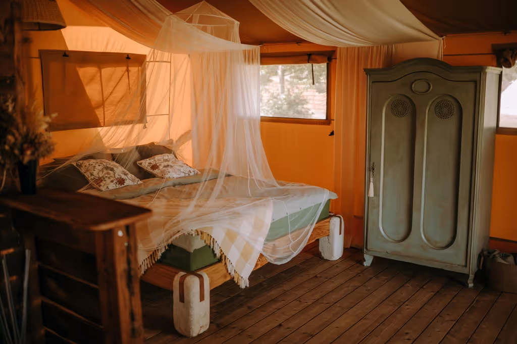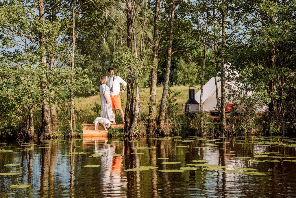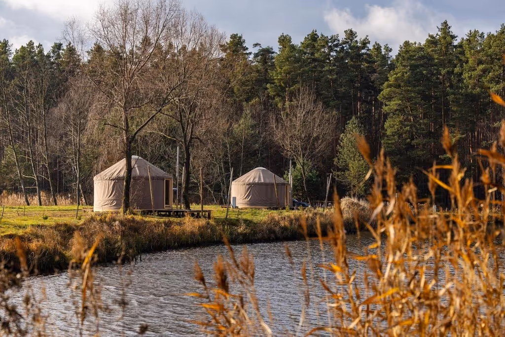 Tym razem w naszym zestawieniu glampingów nad wodą ląduje kaszubska oaza nad brzegiem torfowego jeziorka, więc kąpiele są wskazane. Mają tu tylko trzy kameralne namioty safari, każdy o powierzchni 25 m², urządzone w stylu boho. Dodatkowy bajer to zadaszony taras z kominkiem, nad samym brzegiem. Można bujać się w hamaku i słuchać żabich plotek, ale jeśli ciągle Was nosi, na miejscu są rowery. Możecie nimi śmigać po malowniczych ścieżkach rowerowych prowadzących do jezior lobeliowych czy Bytowa. A na miejscu możecie uczestniczyć w bezpłatnych sesjach Tai Chi i Qigong3. Uwierzcie nam na słowo, że chcecie zamówić tu kosze śniadaniowe – lokalne półprodukty do przyrządzenia śniadania i spałaszowania na tarasie. Choć to głównie kryjówka dla par i singli, to starsze dzieciaki też będą miały radochę (od 7 lat). Gospodarze – Iza i Andrzej – są przesympatyczni i zawsze służą pomocą, tworząc przyjacielską atmosferę.