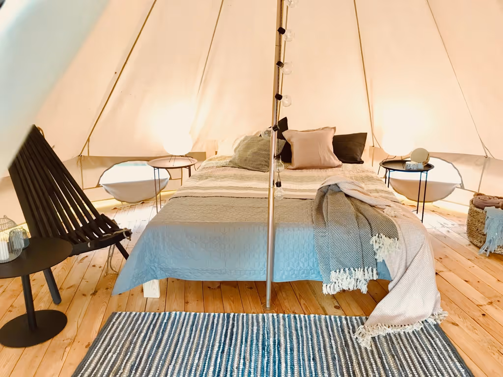 Czas na kolejny glamping z basenem. Tym razem na skraju kameralnej mazurskiej wsi Pelnik, z widokiem na Jezioro Isąg. Oprócz “lake view” i basenu jest tu 6 klasycznych namiotów dzwonowych (bell tent), ustawionych na drewnianych podestach. Pod połami znajdziecie wygodne łóżka dwuosobowe, jest też możliwość dołożenia dostawki – łóżka pojedynczego. Zapleczem glampingu jest wspólny, przestronny dom z w pełni wyposażoną kuchnią, salonem i łazienkami. Jest także zewnętrzna balia, i palenisko. To idealne miejsce dla par, rodzin ze starszymi dziećmi (przedszkolaki z grupy starszaków i młodzież) oraz wszystkich pragnących odciąć się od zgiełku, aktywnie spędzić czas na kajakach, SUP-ach, rowerach czy wędkując na spokojnym jeziorze objętym strefą ciszy. Wisienką na torcie sąi życzliwi Gospodarze, Karolina i Maciek, którzy mnóstwo serca wkładają, żeby było Wam tu jak najwygodniej.