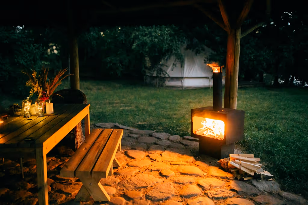 'Magiczne miejsce! Cisza i spokój, idealny pomysł na wyjazd, żeby się zrelaksować i odpocząć. Dookoła las, 5 minut spacerem jeziorko. Prywatna balia to strzał w dziesiątkę, można spędzić chłodny wieczor w gorącej wodzie z uroczymi lampkami na dworze, a po powrocie do glampu nagrzać w kominku. Glamp jest świetnie urządzony, w małym aneksie kuchennym jest wszystko czego potrzeba do zrobienia sobie posiłku, elektryczny grill na zewnątrz jest też bardzo przydatny. Jesienne wieczory można spędzić oglądając Netflix na projektorze albo grając w gry planszowe. Zaczarowane miejsce, do którego z chęcią powrócę. Polecam!'.