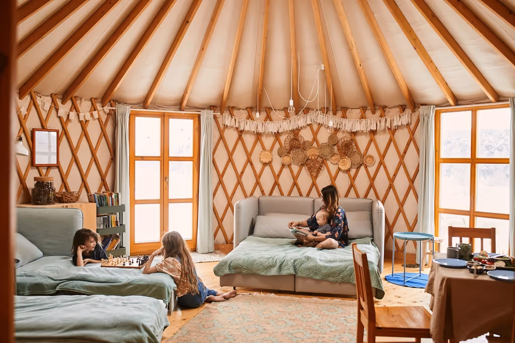 Przenosimy się teraz do serca Świętokrzyskiego, gdzie ukryła się pojedyncza jurta otoczona łąkami, na których pasą się osiołki. Brzmi wspaniale? No to czytajcie dalej. Szumi tu las i rzeczka, podniebienie łechtają wegańskie śniadania. W środku stopy grzeje kominek i ogrzewanie podłogowe, więc takie wakacje w jurcie nie wymagają od Was żadnego survivalu. Jest wygodne łóżko, aneks kuchenny i duży taras, pod który każdego ranka podchodzą osiołki. Na pieszczoty oprócz kłapouszków czekają koty i pies Pestka. To przyjemna przystań dla rodzin z dziećmi i wszystkich, którzy pragną totalnego resetu od miasta. Pamiętajcie jednak, że to autentyczna wieś z jej urokami i fochami – czasem pojawi się mucha, a własne zwierzaki niestety musicie zostawić w domu.