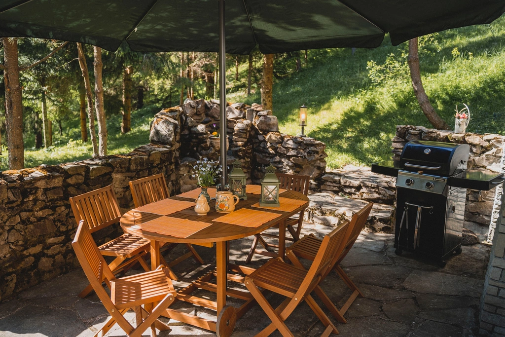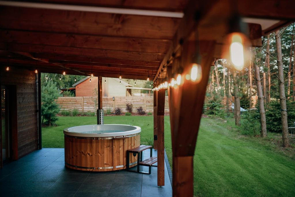 Dwa drewniane domki ukryte w świętokrzyskich lasach to gotowy plan na grupowy wypad. Każdy stoi na osobnej działce, więc macie swoją prywatną enklawę – z własną sauną (w cenie), balią z hydromasażem (dodatkowo płatną) i przestrzenią do totalnego resetu. Przy wypadzie w 6 osób płacicie od 154 zł/os., więc miło. W dzień możecie wyskoczyć na kajaki na Białą Nidę, ruszyć przed siebie rowerem albo odkrywać „Piekło” i „Raj” – pobliskie jaskinie, których już same nazwy są pokusą na wycieczkę. Wieczorem maraton filmowy na projektorze, wspólne gotowanie w przestronnej kuchni albo bąbelki w balii pod gwiazdami. Tu każdy znajdzie coś dla siebie – od gapienia się w brzozy, po wspólne aktywności, które zapiszą się na długo w pamięci.