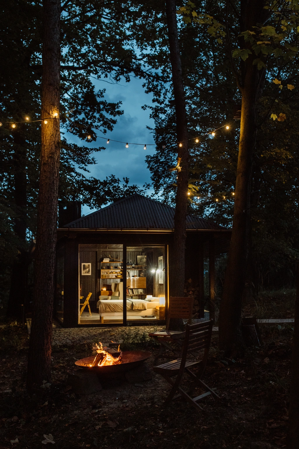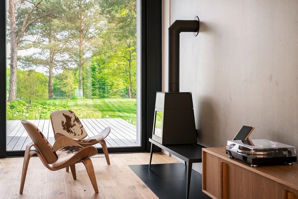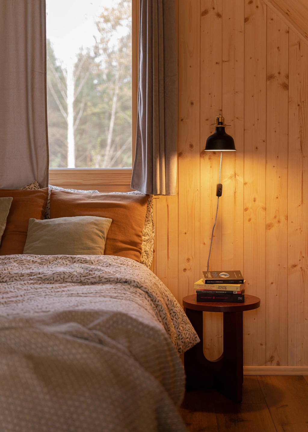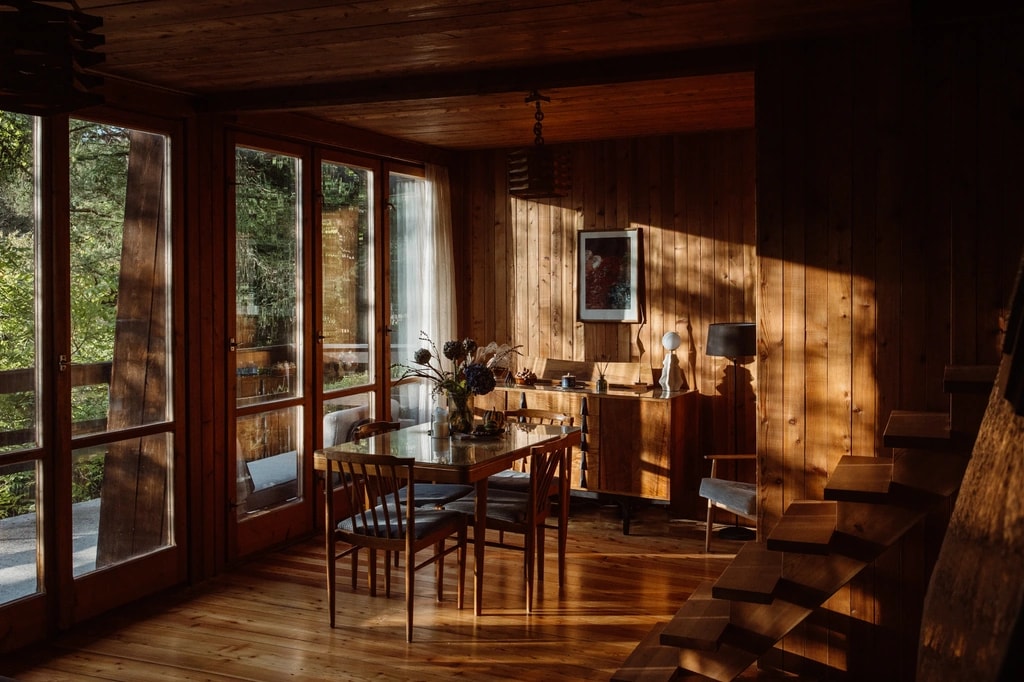 To nie jest zwykły domek w lesie – to modernistyczna perełka o niezwykłej historii. Wysunięta górna sypialnia to patent, który daje wrażenie spania w domku na drzewie w wersji de luxe, a kominek robi tu milusi klimat i może nakłonić największe zmarzluchy do odłożenia skarpetek w renifery na później.