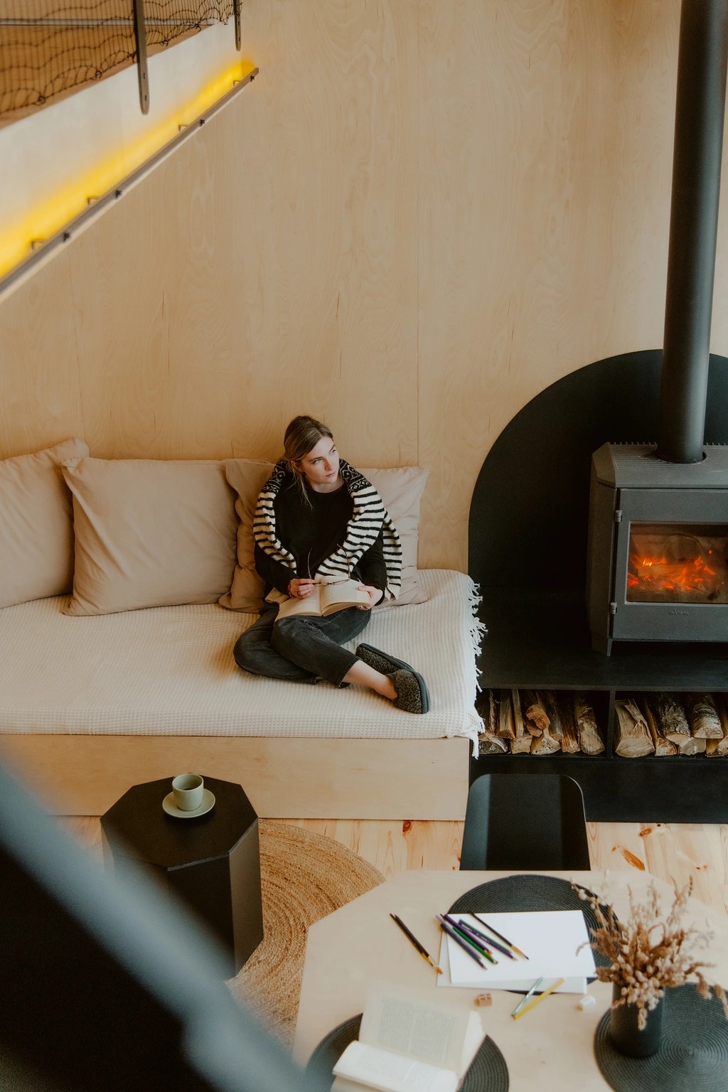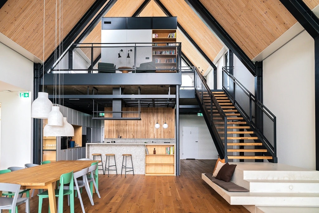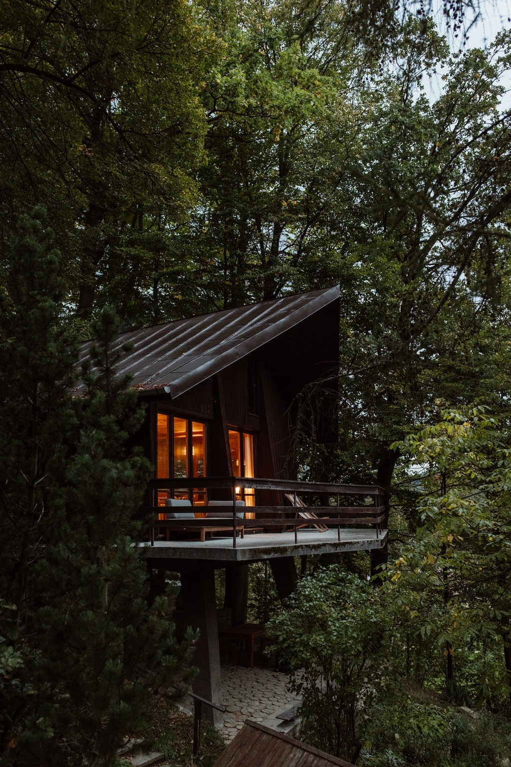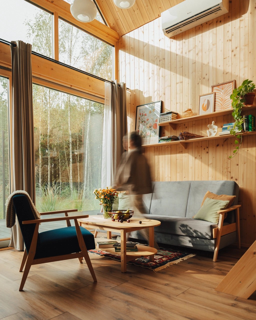 To nie jest zwykły domek w lesie – to modernistyczna perełka o niezwykłej historii. Wysunięta górna sypialnia to patent, który daje wrażenie spania w domku na drzewie w wersji de luxe, a kominek robi tu milusi klimat i może nakłonić największe zmarzluchy do odłożenia skarpetek w renifery na później.