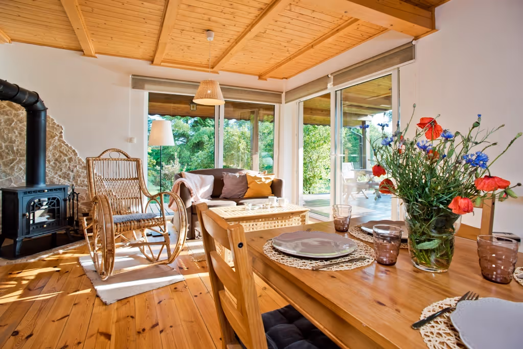 Pierwszy dom w zestawieniu. Jezioro Szymonek, drodzy państwo, Mazury. Przepiękne wnętrza, to trzeba przyznać, a z opinii po pobycie widać, że gościom służą i one, i dostęp do jeziora, i fajni gospodarze. Dom dostajecie na wyłączność, do Waszej dyspozycji jest sporo miejsc piknikowych, gorąca beczka, można się w zasadzie nie ruszać poza bramę. Dom gospodarzy jest obok, jeśli macie psa - zaznaczcie to rezerwując na Slowhopie.