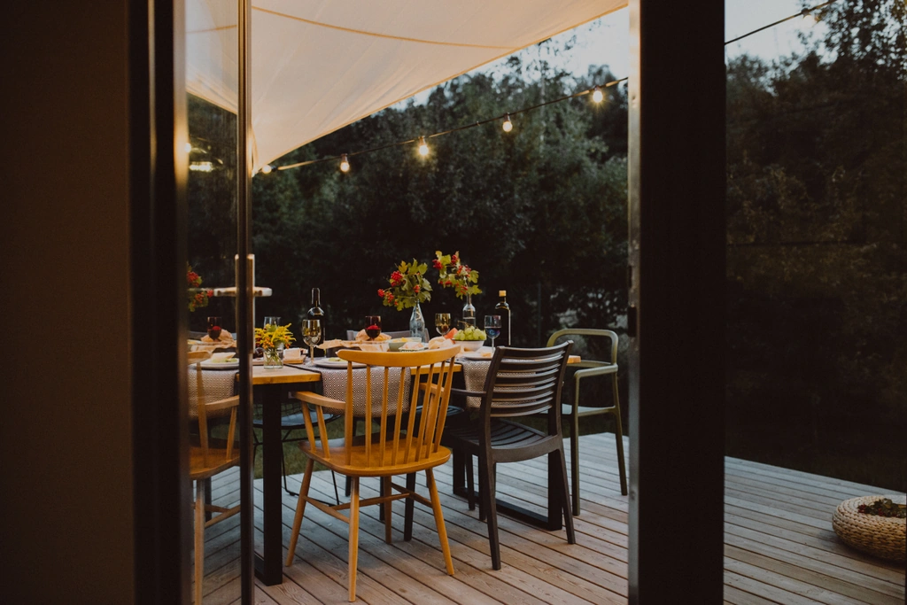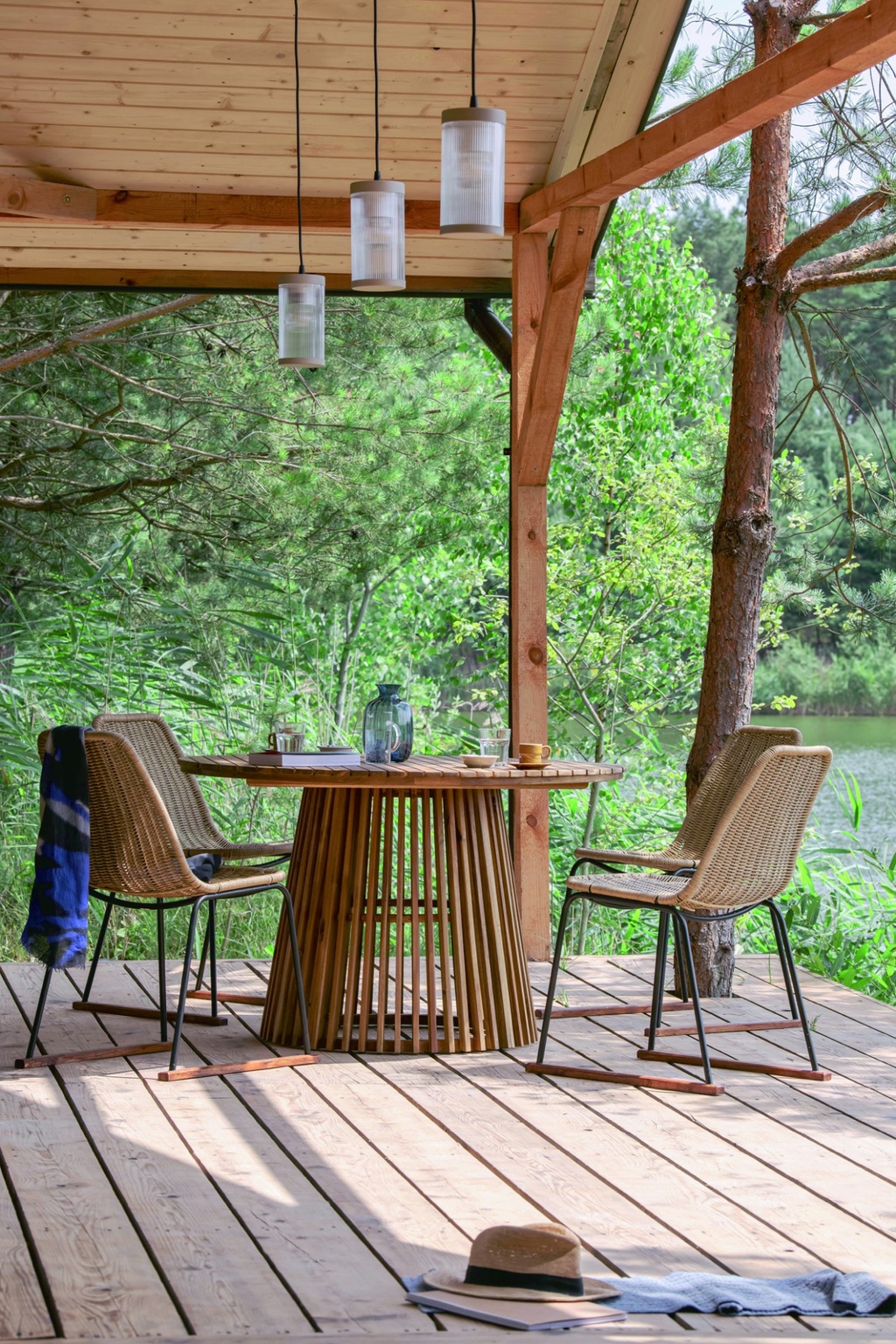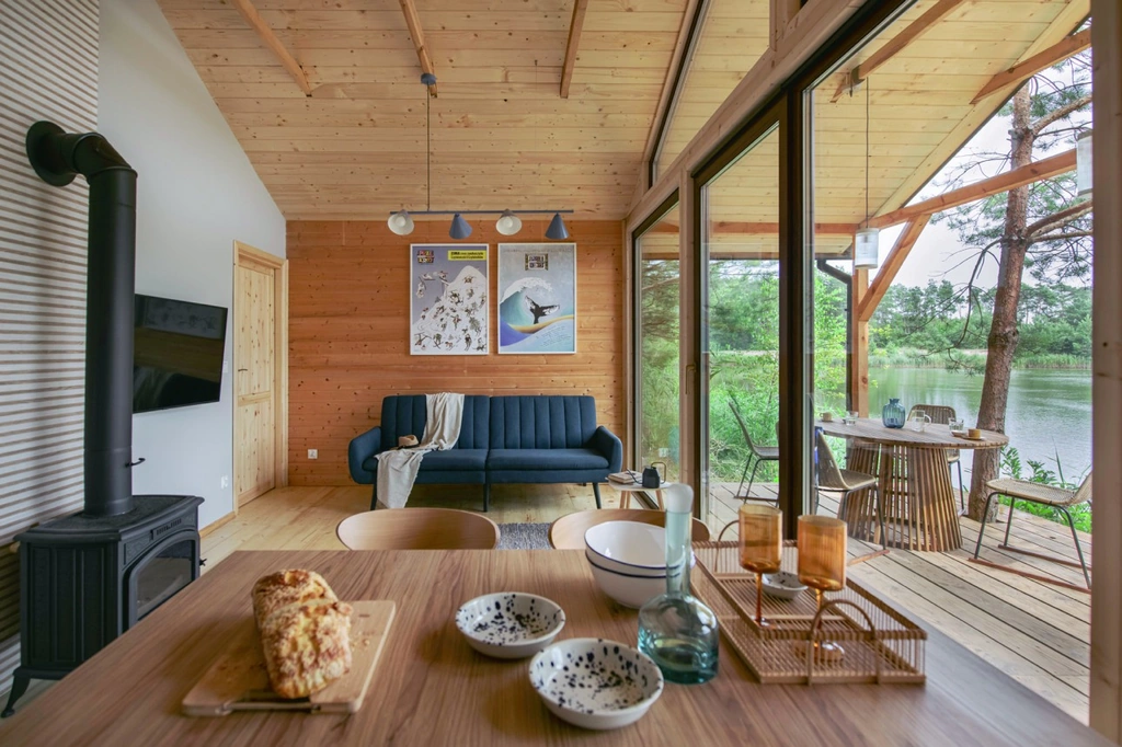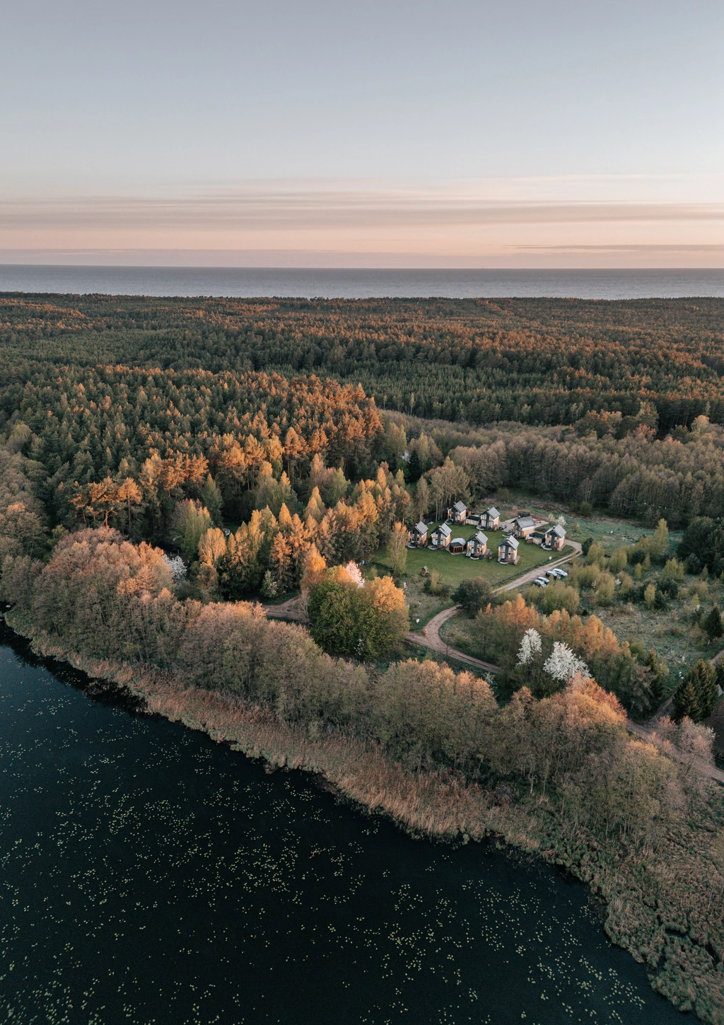 Kilka setek kroków od Bałtyku, na polanie wśród sosen i bliziutko jeziora stoją domki. To przystań dla tych, którzy zamiast kurortowego zgiełku wolą luksus ciszy, jezioro za oknem i ogień trzaskający w kozie. Właśnie tutaj można z łatwością pielęgnować jesienne rytuały: spa pod chmurką w saunie, czytanie książki na huśtawce i taras w pakiecie z gorącym napojem i wspólnym grzaniem się pod kocykiem. Jeśli lubicie wplatać w plan dnia aktywność ruchową, okolica obfituje w Green Velo, a witanie lub żegnanie morza o wschodach i zachodach słońca chyba nigdy nie nudzi się tym, co mieszkają na co dzień z dala od plaż.