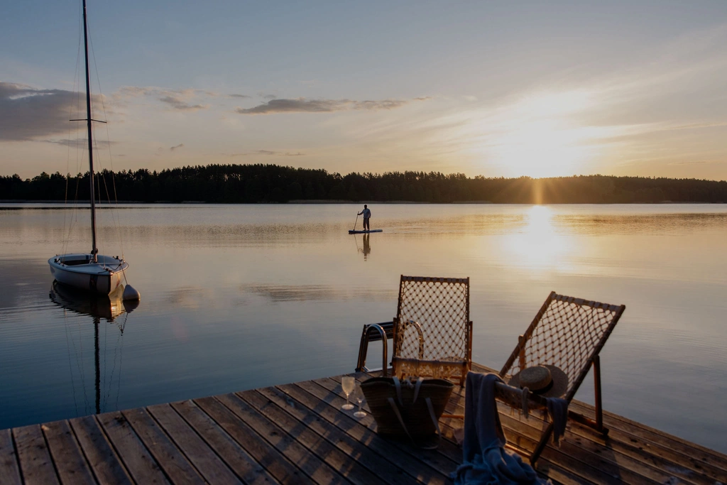 Dla każdego luksus znaczy coś innego. Dla nas to prywatne jezioro bez tłoku na pomoście, dwa SUP-y do dyspozycji i zero stresu. Brzmi jak marzenie? To wpadajcie o tu – do dwóch domków krytych strzechą – małego i dużego, z sauną, pomostem, kajakami, pontonami i nadwodnym chillem. Można pływać, łowić, dryfować w ciszy, a nawet i gadać z końmi, bo tu mieszka cała menażeria: kuce, kury, koty i psy. Można też wykupić posiłki na miejscu, albo skorzystać z możliwości odpalenia grilla nad jeziorem. Przybywajcie – tu schłodzicie się po kąpielach słonecznych, powygrzewacie na pomoście i przypomnicie sobie, za co tak bardzo kochacie lato.