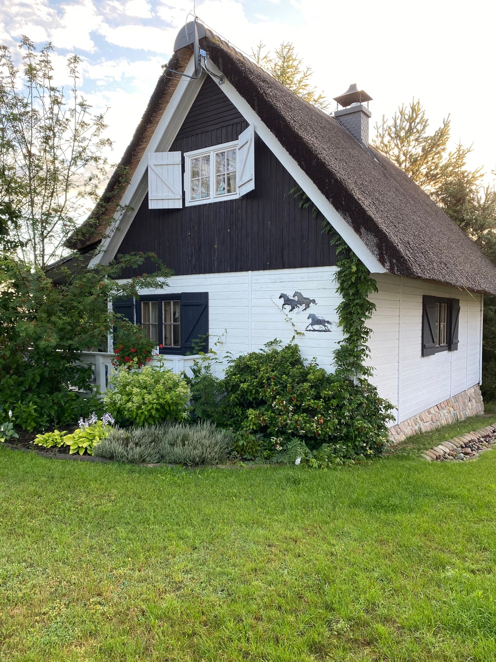 '(...) Domek gustownie urządzony, przytulny, czysty i pięknie pachnący. Mimo kiepskiej pogody podczas naszego wyjazdu (a może właśnie dzięki niej?) zapewnił nam przytulne i ciepłe schronienie przed deszczem. W pełni wyposażonej kuchni bez problemu można upichcić wszystko czego dusza zapragnie. Miłym zaskoczeniem było rozrywkowe wyposażenie salonu - gry planszowe, ciekawe albumy podróżnicze, głośnik Bluetooth i projektor wraz z zainstalowanym na suficie ekranem umiliły nam deszczowy czas. Domki znajdują się na pięknej trawiastej działce, na której otwarta przestrzeń (idealna dla naszego hałasującego Goldena) łączy się z zacienionym fragmentem gaju - tam znajdują się strefy hamakowe i ogniskowo-jadalne. W okolicy (wystarczy przejść na drugą stronę ulicy) znajdują się liczne zejścia do jeziora. Odległość od morza to zaledwie 15-20 minutowa przejażdżka autem lub (dla psio-opiekunów) dwugodzinny spacer w otoczeniu malowniczych pól i tajemniczych leśnych wąwozów. (...) '.