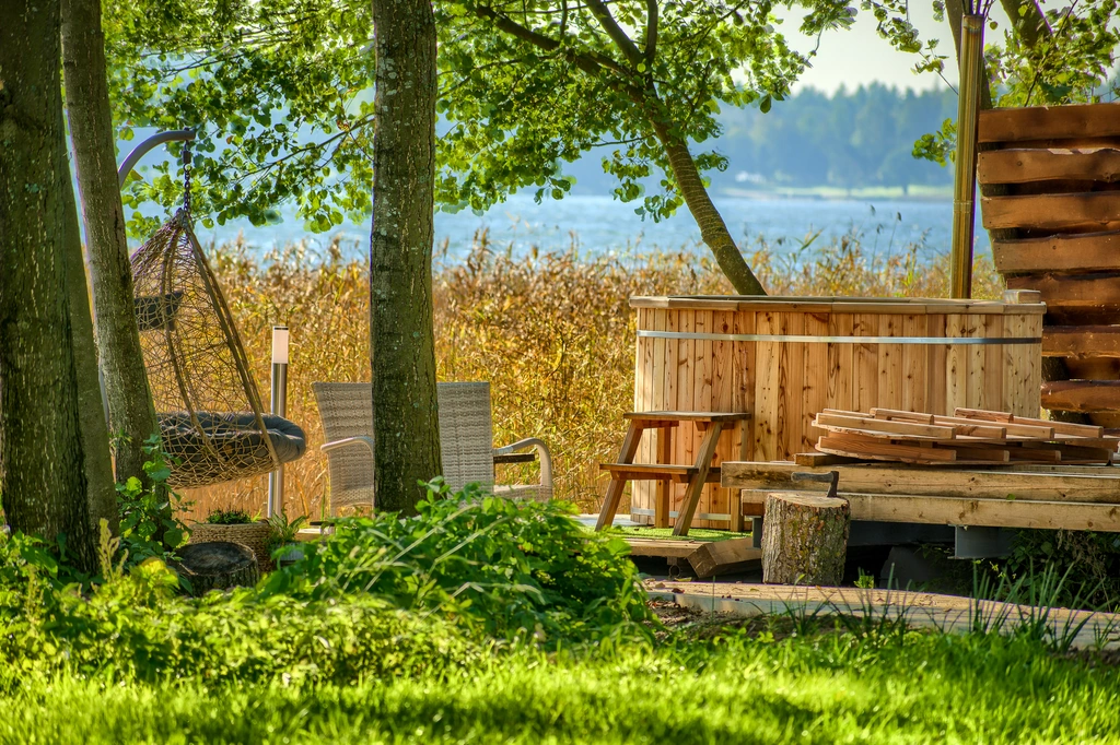 Balia wersja kaszubska czyli wstajesz, 3 minuty później dajesz nura do balii, a potem czekasz aż ktoś poda “kawę” przez kuchenne okno. Rzecz się dzieje pośrodku Kaszubskiego Parku Krajobrazowego, tuż przy jeziorze Kamionka. Domki są dwa i każdy ma prywatną, przytuloną do domku balię, a pośrodku stoi sauna do podziału, w której można odparować zmartwienia, a potem, jeśli starczy odwagi, spłukać ich resztki pod chmurkowym prysznicem. Dzieciaki mają frajdę bo mogą robić bazę na antresoli, wybiegać nadmiar energii na zielonym, pluskać się w jeziorze, a wieczorem padać jak kawki przy planszówkach. Rodzice zaś szczęśliwi, nasłuchują uroczego chrapania wprost z balii, która po zmroku przechodzi w ich władanie.