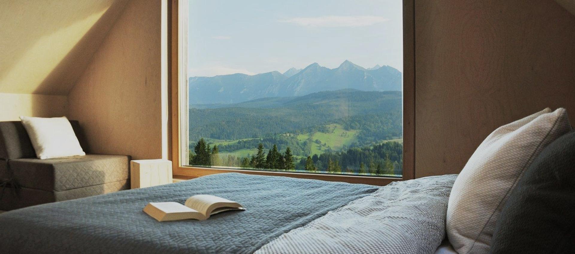 Okno na Tatry pojawiło się na Slowhopie całkiem niedawno, ale od razu pozamiatało. Historia jest taka, że Wojtek, pasjonat gór i kolarstwa (i autor przewodnika po rowerowych ścieżkach Tatr), przemierzając pustkowia w okolicy, natrafił na to wzgórze w Dursztynie, za wsią na końcu świata i z widokami jak z pocztówki. Nie mógł przejść obojętnie i postawił tam Okno na Tatry z trzema uroczymi ślepiami. Wszystkiemu przyświeca brawurowe hasło “make views not walls”, więc widoki na szczyty będą równie imponujące z poziomu sofy, łóżka i śniadania. Kanapy stoją twarzą do okien, na łóżko wspinacie się po drabino-schodach na antresolę, a tam obserwujecie widoki przez ok(n)o na górskie szczyty.